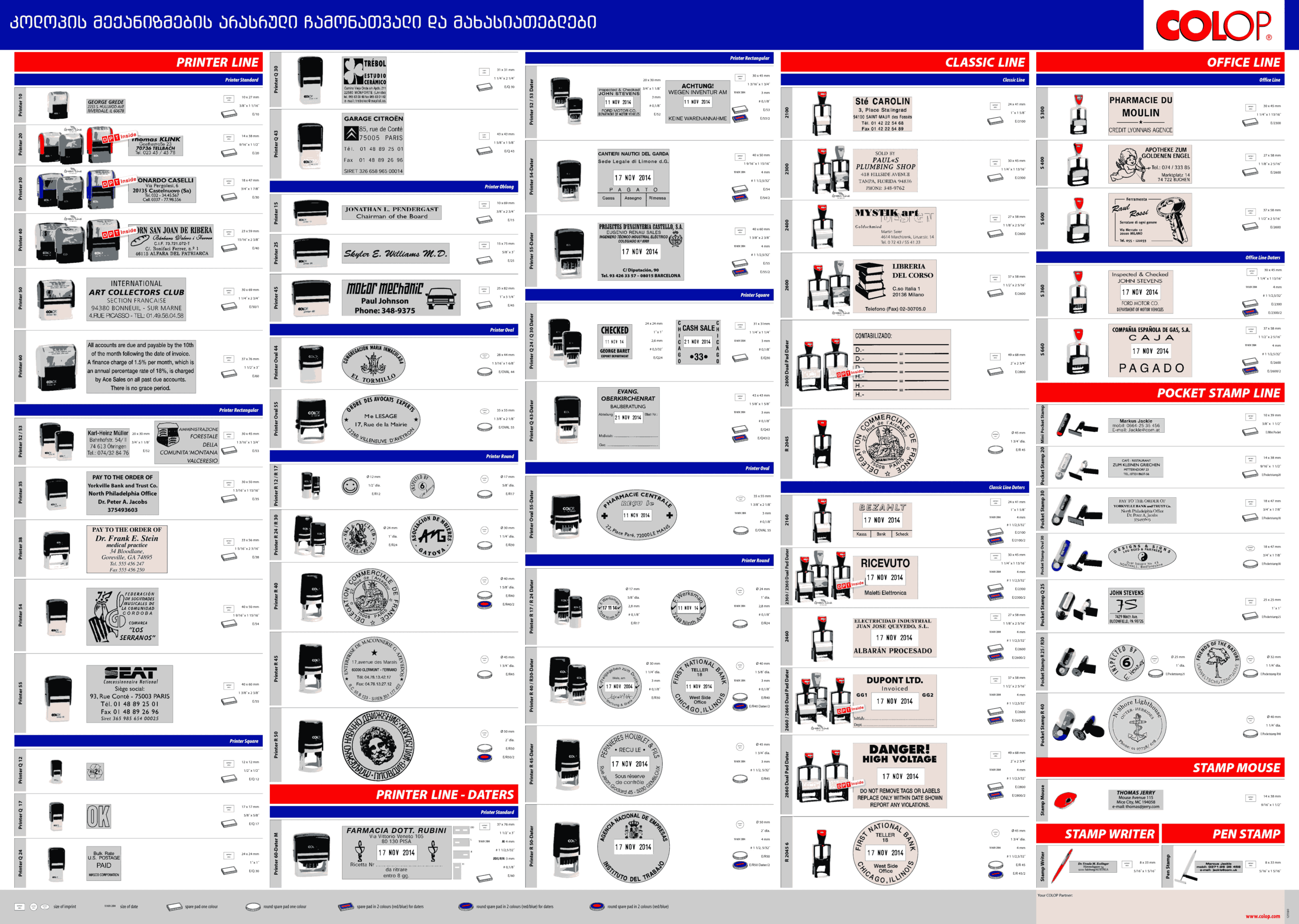 “კოპიპრინტში” შეგიძლიათ დაამზადოთ ნებისმიერი სირთულის ბეჭედი, შტამპი და ფაქსიმილე. შეუკვეთოთ სხვადასხვა ზომისა და ფორმის ნომერატორები, თარიღატორები და მექანიზმები. ჩვენ ხელი მიგვიწვდება მსოფლიოს საუკეთესო ფირმების პროდუქციაზე და პასუხს ვაგებთ შეთავაზებული მომსახურების ხარისხზე. ქვემოთ გთავაზობთ მექანიზმების ნუსხას კლიშეს დამზადებით, რომლებიც შეგიძლიათ შეუკვეთოთ.